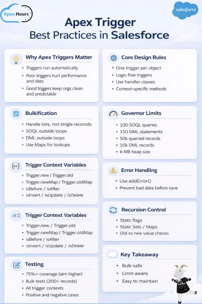 Following these Apex trigger best practices leads to scalable, maintainable, and robust Salesforce applications. Keeping code organized, efficient, and well-tested ensures that your automation works reliably as your org evolves.