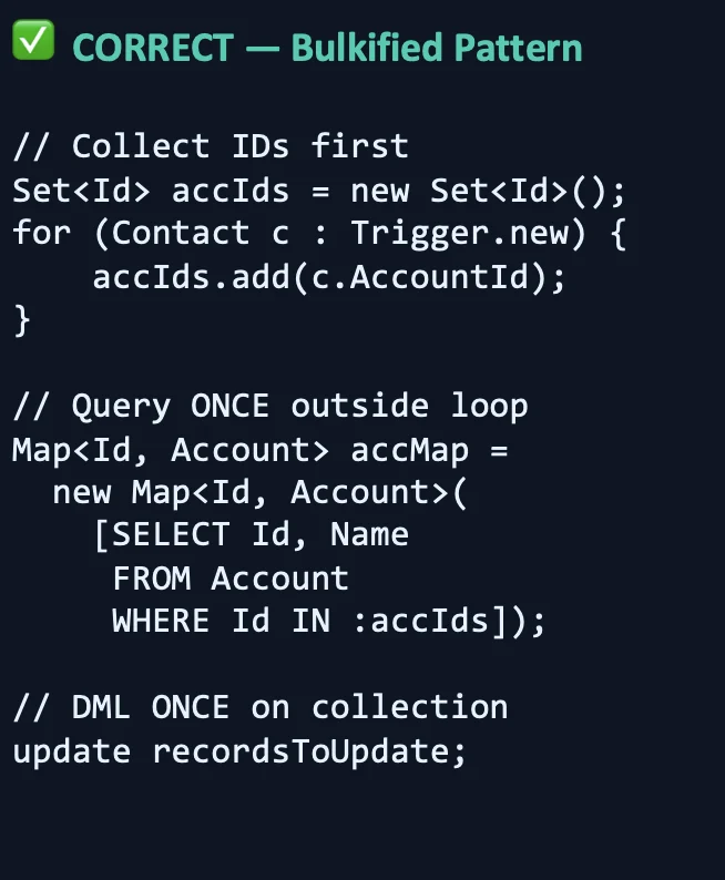- Never perform SOQL queries inside loops – collect IDs first, then query once outside the loop