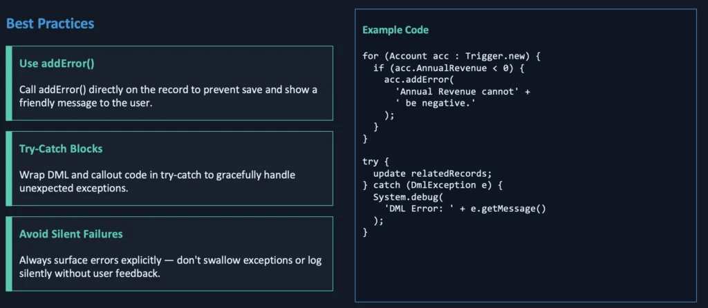 Implement proper error handling with try-catch blocks and use addError() method on records to provide user-friendly validation messages rather than letting exceptions bubble up.