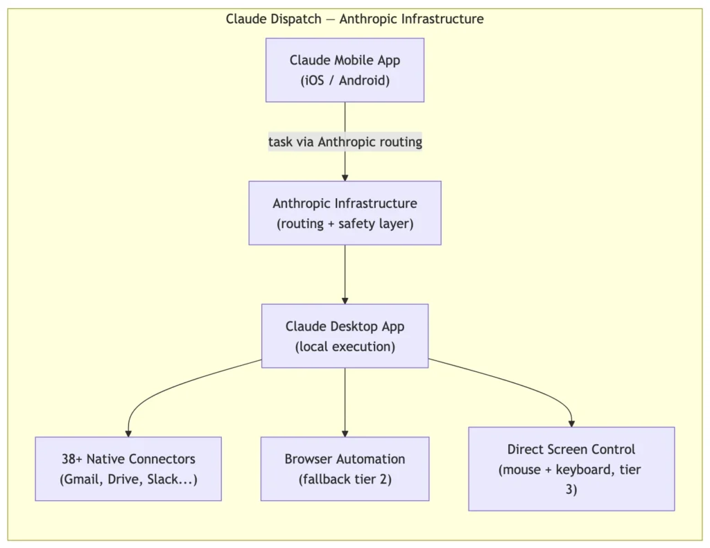Claude Dispatch solves a specific problem: the gap between your phone and your desktop. The architecture is almost deliberately simple to explain. Your phone becomes a messaging interface. Your Mac does all the actual work. QR code pairing connects the two. Tasks you send from the Claude mobile app get routed through Anthropic’s infrastructure to your desktop, where Claude executes them locally with full access to your files, browser, and applications.
