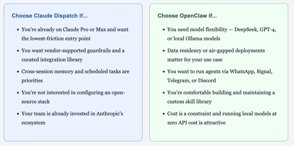 Both use a tiered approach to capability. OpenClaw’s skill system and Claude Dispatch’s connector-then-browser-then-screen-control fallback ladder are solving the same problem: how do you reliably expand what an agent can do without requiring users to rebuild every integration from scratch?