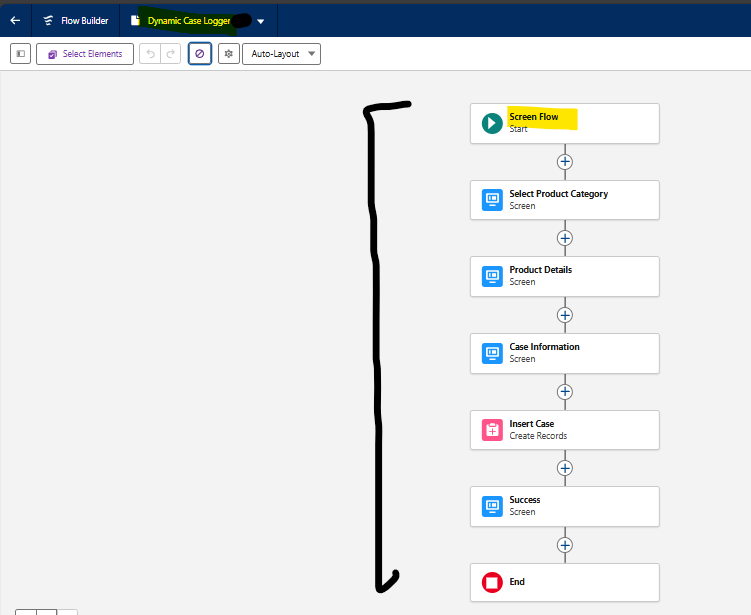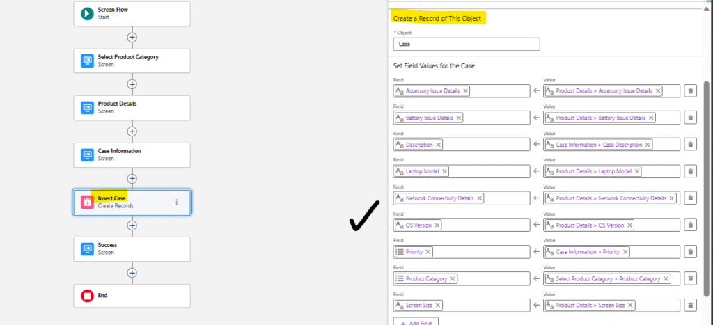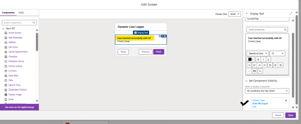 - If for any reason the record insert failed (and {!newCaseId} stayed null), this screen stays hidden and the flow simply ends without a message giving you a chance to add an error path later.