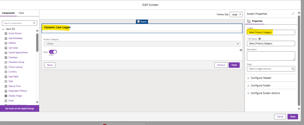- Drag a Screen element; label “Case Information.”