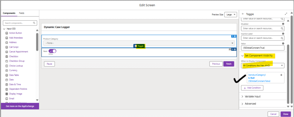 - For each, under Set Component Visibility, reference the Flow variable productCategory and require equality to the matching picklist value.