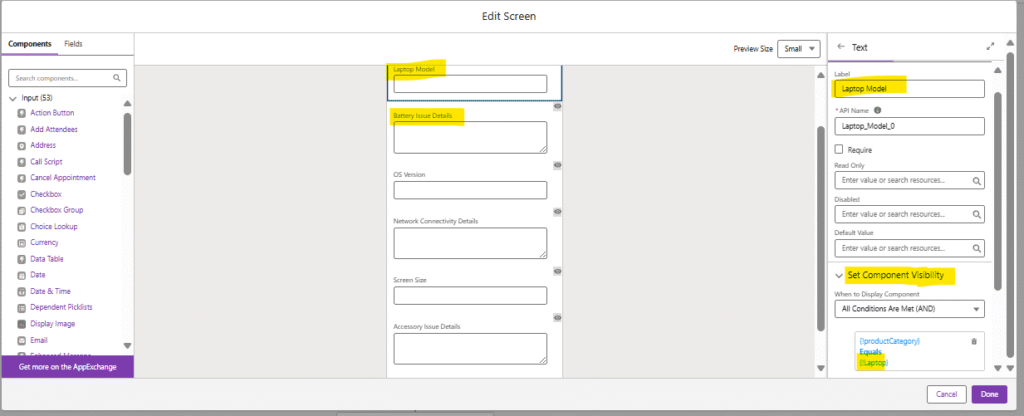 This way, when the flow moves here, agents see exactly two fields appropriate to their earlier pick and nothing more.Below Set Component Visibility condition for visibility of Laptop picklist value similar will be used for other picklist values accordingly: