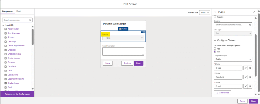 - Add a Picklist component: