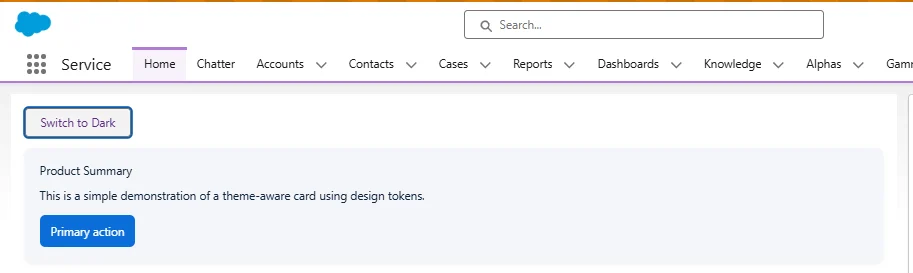 The following example is very minimal for understanding: a single LWC that exposes a toggle and demonstrates theme switching for a small card. This is perfect for understanding and easy to gather all our knowledge.