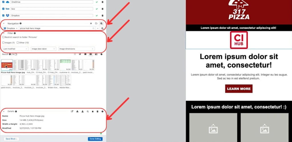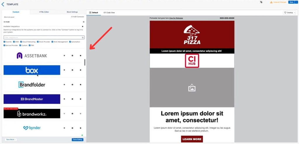 Step #2. Connect your storage systems: Place the CI HUB block on the canvas, and the CI HUB panel will appear. Inside the panel, choose the service you want to link and sign in. Each connected system becomes available for browsing directly in Content Builder.