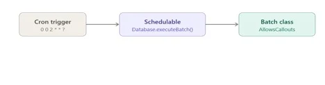 Once the first run is verified, schedule the batch to run automatically. Run this in Anonymous Apex. The following are examples of scheduling: