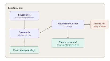 The solution consists of two Apex classes, a Custom Hierarchy Setting, and a Named Credential backed by an External Credential using OAuth 2.0 Client Credentials flow. The classes communicate with the Salesforce Tooling API to query and delete Flow versions.