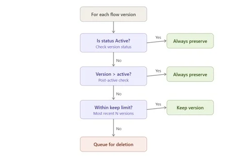 - If no active version exists for a Flow, treat all versions as eligible and still keep the most recent N, deleting the rest.