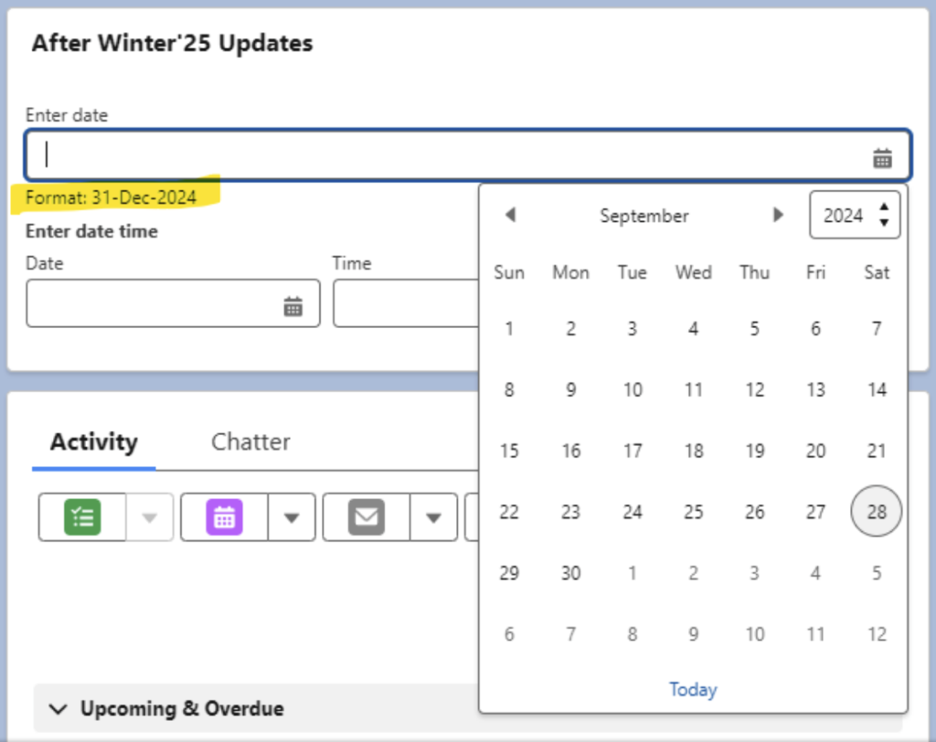 The lightning-input component now provides better feedback for input types date and datetime. Salesforce has introduced a subtle yet impactful change: the expected date format now displays below the text input field, guiding users who manually enter dates rather than using the date picker.