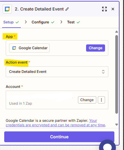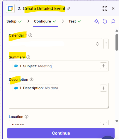 Zapier now shows fields for the new Calendar event. Here’s how we can map them: