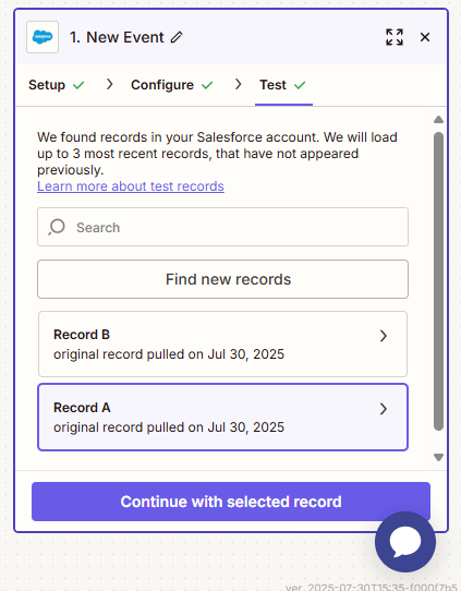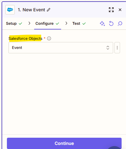 - Click Continue, then Test Trigger. Zapier will fetch a recent Event from connected org as a sample.