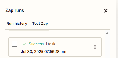 - In Zapier, click the Zap History icon (top menu) to see if your Zap fired successfully.
