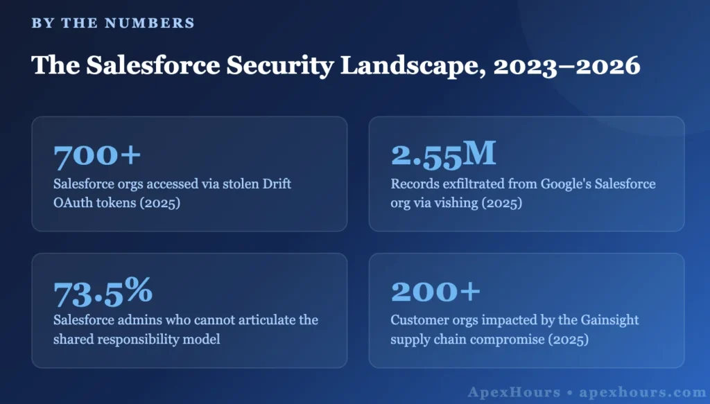 This guide is a practitioner’s field manual. You’ll walk away with a clear picture of how attackers actually get into Salesforce orgs, which misconfigurations keep coming up in real incidents, and a 20-point hardening checklist you can start working through this week.