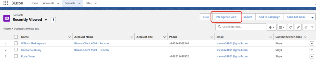 In contrast to the List View, where users must open each Contact/Lead individually to take actions such as sending emails or logging calls, the Intelligence View offers a dedicated action column. This allows users to seamlessly perform these tasks directly from the interface by simply clicking on the respective icons next to each record.