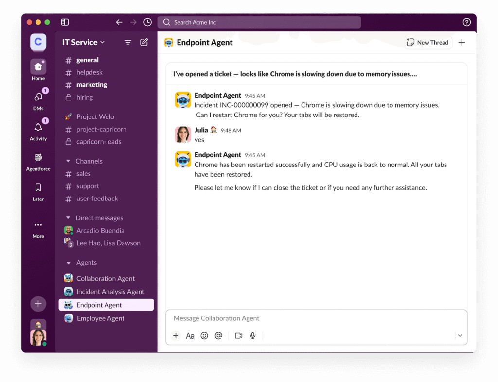 - Seamless AI-to-human handoff: If an issue requires human attention — such as a security breach — Agentforce transfers the case to an IT professional with full context, minimizing back-and-forth.