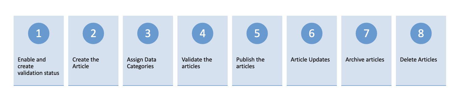 Salesforce Knowledge base is built from knowledge articles, which are documents of information. Articles can include information on process, like how to reset your product to its defaults, or frequently asked questions, like how much storage your product supports