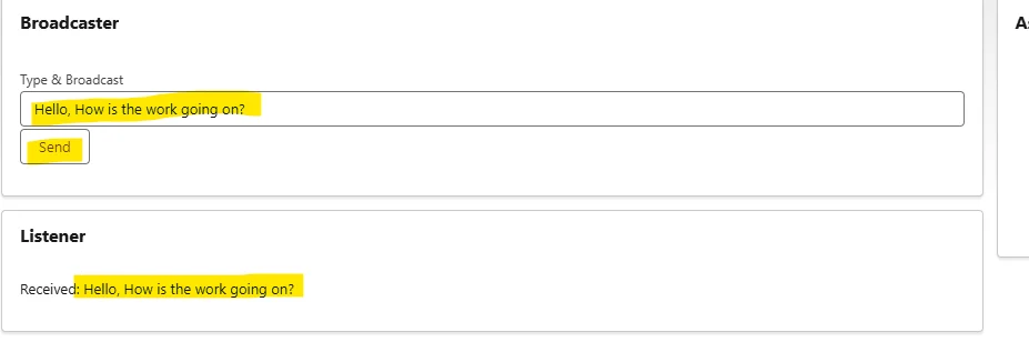 Post adding some message and clicking on ‘Send’ button from Broadcaster the message will sent to Listener: