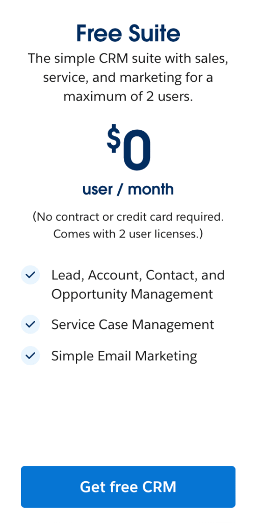 | Free Suite | Individuals, micro-businesses, and start-ups. Those unfamiliar with CRM who want a simple and focused experience. | Free. Built for small teams. Combines customer activity, service cases, sales pipeline, and Slack messages in one place. |