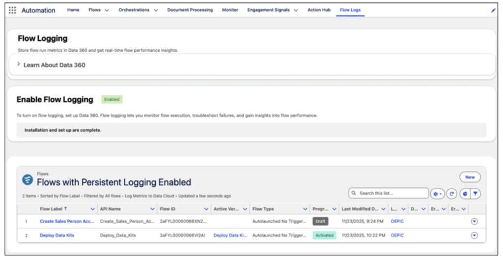 Debugging and monitoring flows has always been a challenge. Spring ’26 introduces a central place to handle this with Flow Logs.
