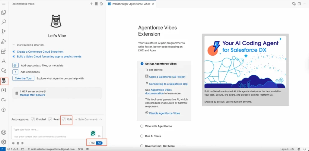 - Metadata Understanding: Vibe Codey introspects your Salesforce org’s metadata, existing code, data model, and schema before generating code.